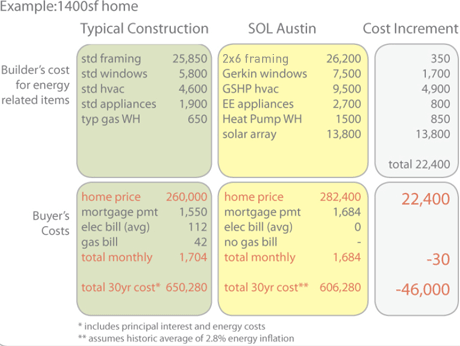 For a 1400 sq ft house this premium is about $16 per square foot or $22,400 in addition initial cost due to energy related items when compared to conventional construction. This cost premium represents about a $130 per month increase in a 30 year mortgage while the building technology is estimated to save about $160 each month in utility bills.